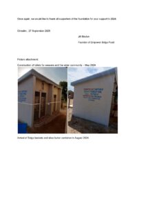 On July 1, 2024, our first building (2+2 toilets) was opened in the presence of our weavers and members of the local government to serve both the weavers and the wider community in Bolgatanga. Unfortunately, in the poor area of Bolgatanga, basic sanitation is not at all commonplace. In discussing this with the local people, we agreed that this is very much needed for the area. The funds for the construction of the sanitation facility were used entirely with the collection from the sale of hand-weaved Bolga bags. Thanks to all our supporters.