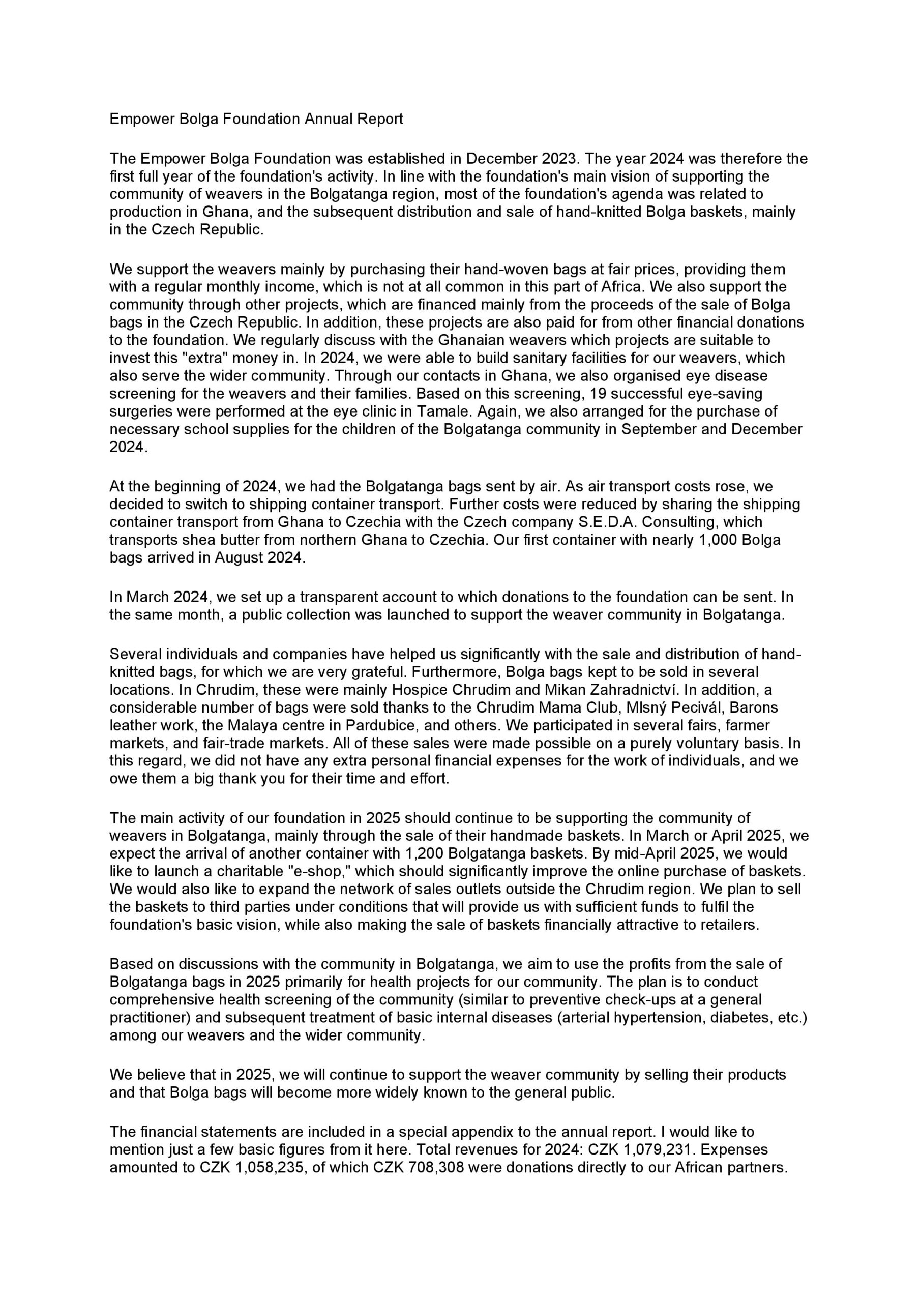 were covered by the proceeds from the sale of Bolga bags. In addition to supporting the
